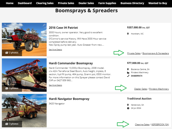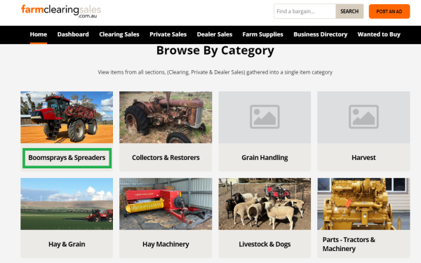 Eg. Selecting the Tractors & Loaders category from Browse By Category will display results for any Tractor or Loader that is for sale at a Clearing Sale, a Private Ad or in a Dealers yard.